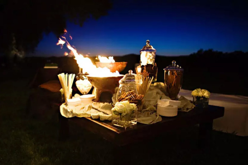 We also love the idea of incorporating a cozy fire into your venue. There are many beautiful wedding venues with grand fireplaces in their main ballroom, an outdoor fire pit for sitting around and roasting marshmallows, or toasty outdoor heat lamps.