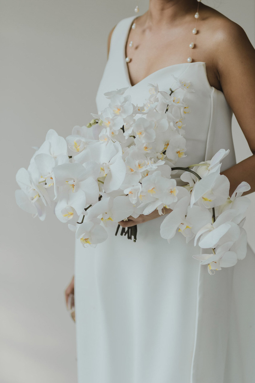 If flowers and/or foliage is one of your must-haves, we recommend choosing just one understated bloom—like white orchids arranged in large luxurious clusters—or even single-stem bouquets and centerpieces. And dried flowers go surprisingly well with the minimalist aesthetic! Or ditch the flowers entirely, replacing them with graceful greenery. Frame your ceremony with delicate strands of ivy or lay lush, leafy runners across the tables for a simple-yet-sophisticated look.
